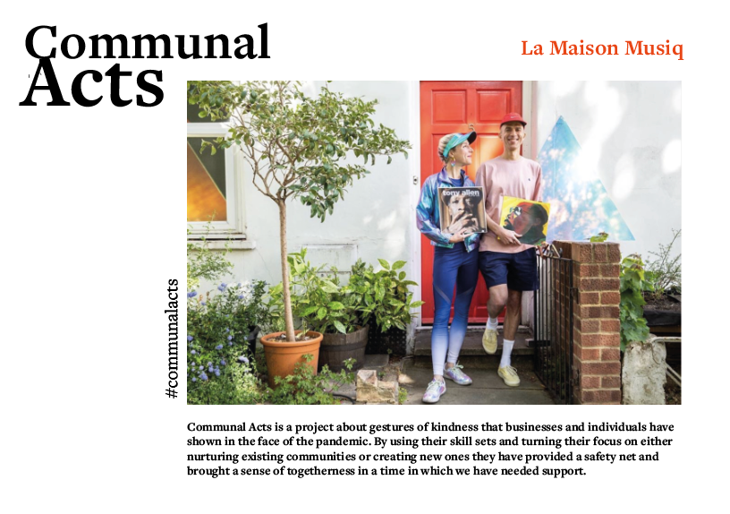 Communal Acts is a project is about gestures of kindness that businesses and individuals have shown in the face of the pandemic. By using their skillsets and turning their focus on either nurturing existing communities or creating new ones they have provided a safety net and brought a sense of togetherness in a time in which we have needed support.